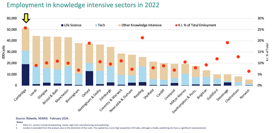 When we look at employment in knowledge intensive sectors (excl. London), Cambridge has a good balance of life science, tech and broader knowledge-based companies. It also has the highest % of the workforce within high growth industries.
